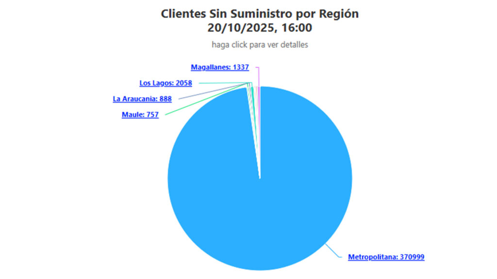 Un masivo corte de energía eléctrica afecta a miles de hogares en distintas regiones del país este lunes 20 de octubre de 2025, siendo la Región Metropolitana la más impactada con 370.999 clientes sin electricidad, según el informe de la Superintendencia de Electricidad y Combustibles (SEC).