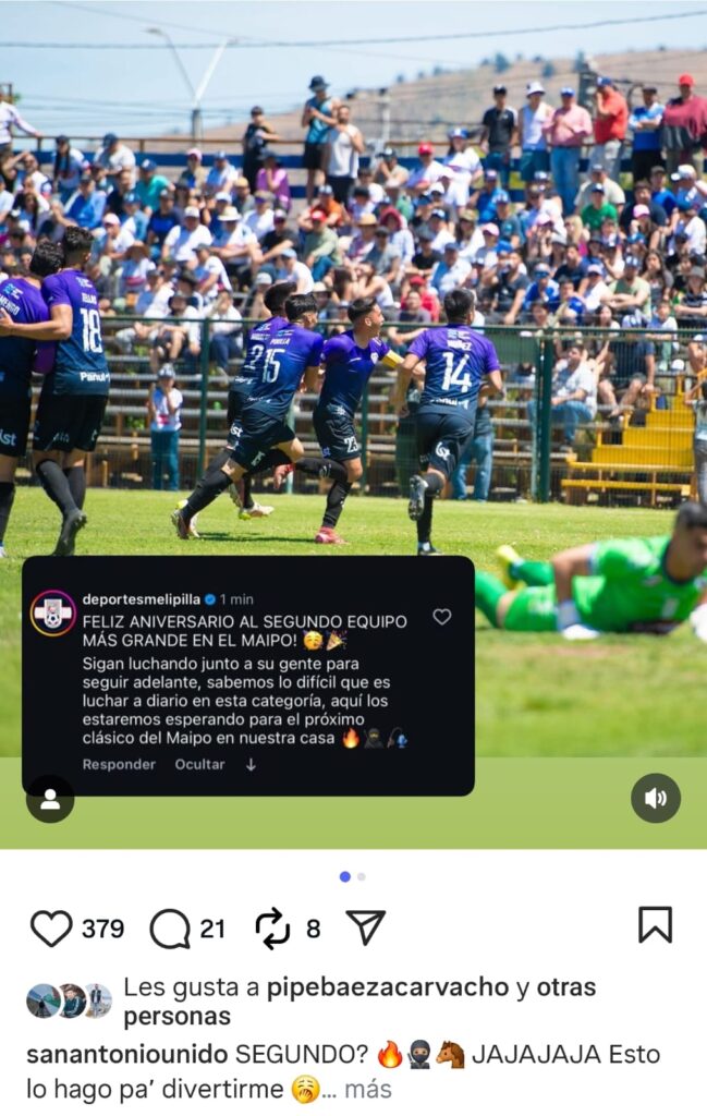 Los lilas recordaron una publicación anterior de Melipilla, realizada durante el aniversario del club sanantonino, en la que los “Potros” habían saludado al SAU refiriéndose a ellos como “el segundo equipo más grande del Maipo”.