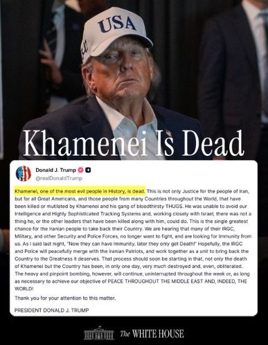 El presidente de Estados Unidos informó a través de Truth Social el fallecimiento del ayatolá Ali Jamenei. En su mensaje, aseguró que los ataques contra Irán seguirán “mientras sea necesario”.
